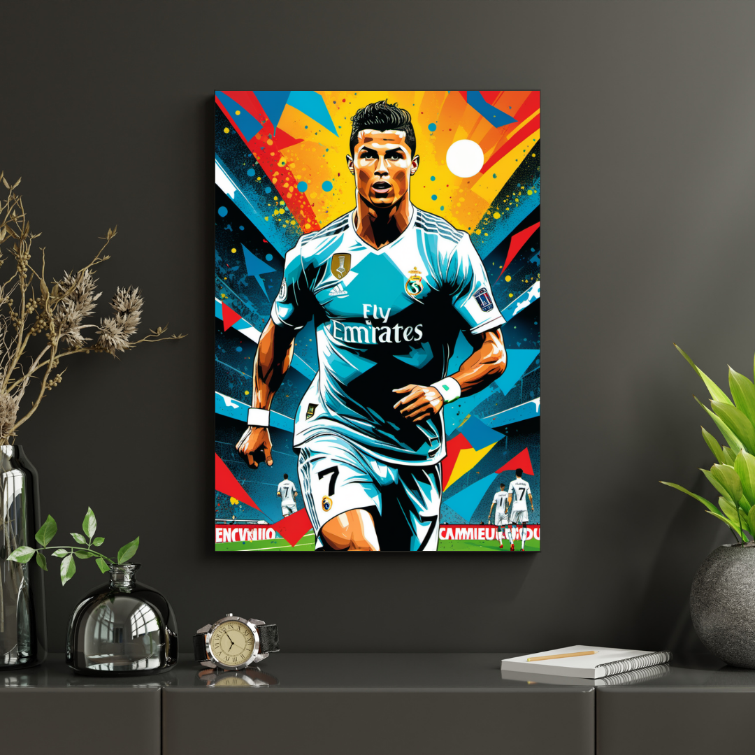 Celebrate one of football’s greatest players with this bold Cristiano Ronaldo wall art print. Featuring Ronaldo in his iconic Real Madrid kit, this artwork captures the energy, passion, and legacy of CR7 on the pitch.